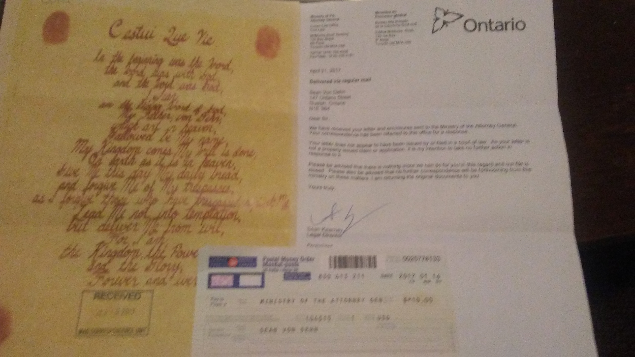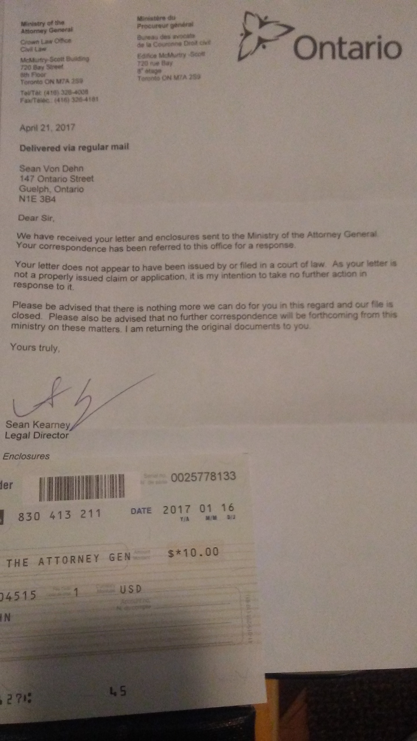 Again, to be King, One must think like a King. This letter is a disgrace to law, as are the returned, stamped documents. Blatant, prima-facie evidence of disregard for the common law when a common law court is being demanded for justice. And by a legal department, no less. There is a superior court in Guelph to have these default judgments properly addressed.