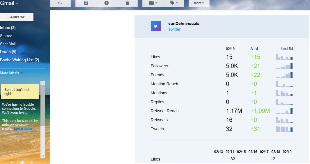 There are three screenshots pictured above. The first is from My e-mail account from Commune.it, an application that sends Me a daily report of My last week on Twitter. I started using it near the beginning of the month at which time it said that I had gained roughly 600 followers over the week and lost about a quarter (150), for a difference of 450 – in a week! This week it says I gained 940 followers and lost 292, a difference of 648. The number of overall followers has gone up consistently with the exception of Ash Wednesday where I did appear to lose roughly 40 followers more than typical. Certainly a huge discrepancy from the actual number of followers I have gained over the last week on Twitter (roughly 200). The second report is from Twitter analytics and shows 170,000 impressions for the month so far, up 130% over last month, proving that the extra effort invested in scheduling regular Tweets with Hootsuite and Buffer is well worth the effort. Finally, the third shows another e-mail from an application called Sum of All, which provides insight on reach, retweet and mentions of Tweets. As You can see, it shows I made over 1 million impressions on Twitter yesterday alone. So it is very difficult for Me to have any Idea which of these statistics are reliable, if any.